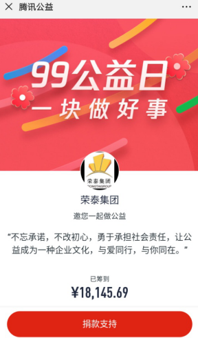 9月5日至15日,為加強(qiáng)企業(yè)文化建設(shè),奉獻(xiàn)榮泰人的愛心,建設(shè)“仁者愛人、與人為善”的富有人文關(guān)懷的慈善愛心企業(yè),激勵(lì)榮泰人以慈善為本,以榮泰人為榮,實(shí)現(xiàn)企業(yè)同發(fā)展、共雙贏的情懷,集團(tuán)積極參與“騰訊公益慈善基金會(huì)”聯(lián)合舉辦的“99公益日一塊做好事,榮泰集團(tuán)慈善一起捐”活動(dòng)。