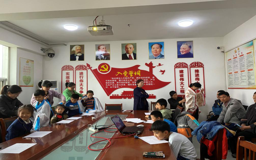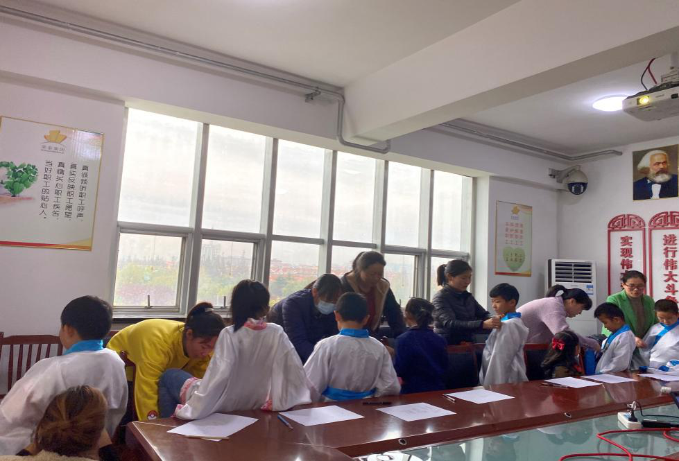 職工及家屬帶著孩子們來到會議室,孩子們一個個熱情高漲,臉上洋溢著燦爛的笑容,職工及家屬們也都面露喜色,期待著這次別開生面的開營典禮。為營造國學(xué)課的良好氛圍,典禮開始之前,吳主席組織家長給孩子們換上漢服,孩子們穿上漢服,開心地站在父母身側(cè)。