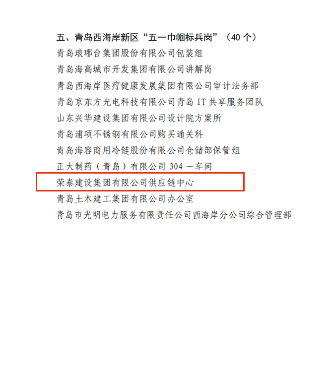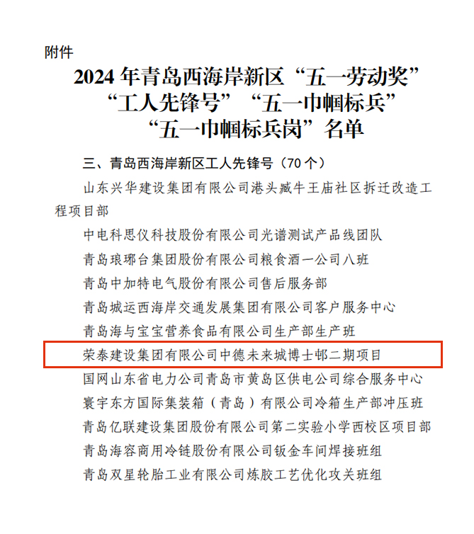 近日,西海岸新區(qū)總工會(huì)印發(fā)《關(guān)于公布 2024 年青島西海岸新區(qū)“五一勞動(dòng)獎(jiǎng)”“工人先鋒號(hào)”“五一巾幗標(biāo)兵”“五一巾幗標(biāo)兵崗”的通知》,隆重表彰了西海岸新區(qū)各行各業(yè)的先進(jìn)集體和先進(jìn)個(gè)人。榮泰建設(shè)集團(tuán)2個(gè)集體、3名個(gè)人光榮上榜。